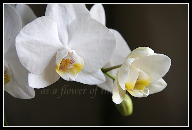 Last year my sweetheart gave me an orchid at Valentine’s Day – pure white with yellow at the centers. It was blooming beautifully. I enjoyed it for months. After all the blooms had dropped off I trimmed the stalks and kept watering like I had before. A few months later I noticed a small shoot growing from the base of the leaves. After a while another shoot grew and now, almost a year later, in the middle of winter, there are two stems absolutely loaded with blossoms, even more than last year. I feel like I’ve witnessed a miracle!